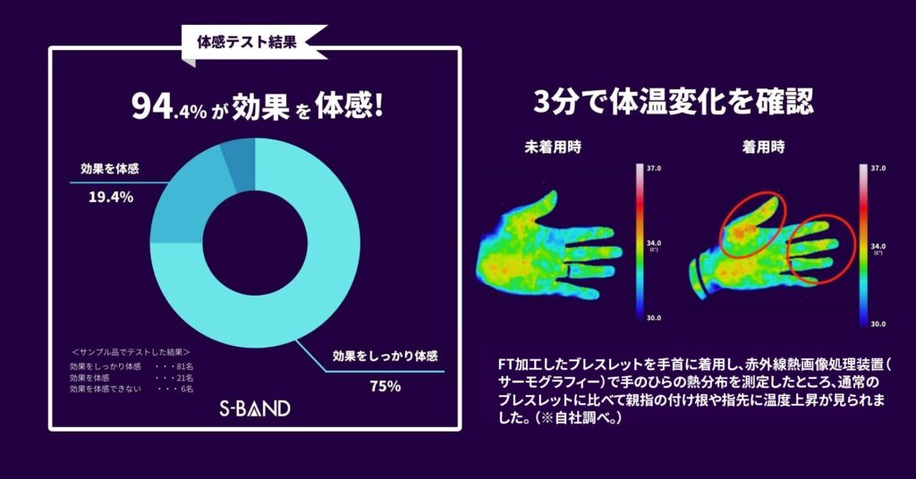 - 着用3分後に体温変化を確認し、約95%が効果を実感。