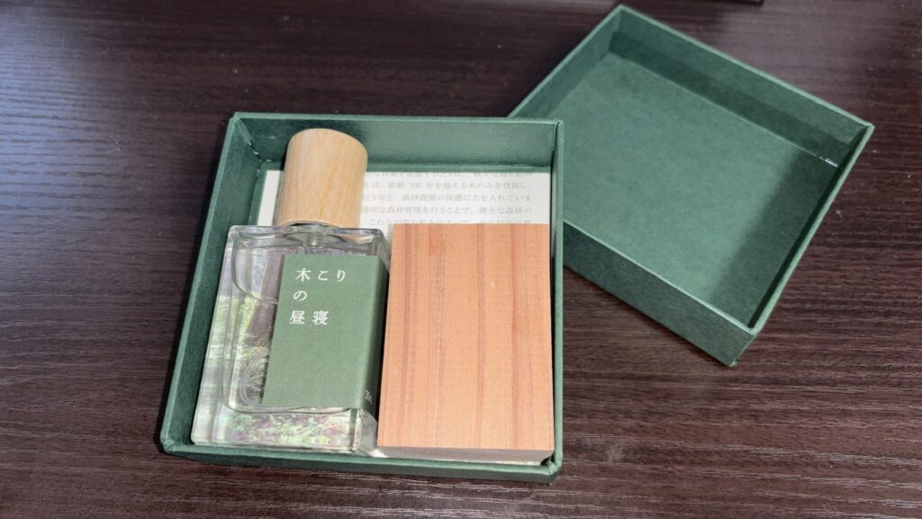 金山杉の深いリラックス感を、利用したフレグランスが「木こりの昼寝」というわけです。