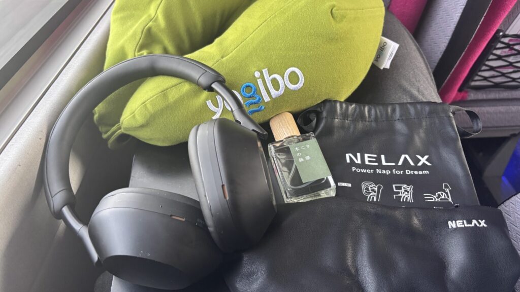 移動中は、NELAXの加重アイマスクと木こりの昼寝をセットで持ち運んでいます。