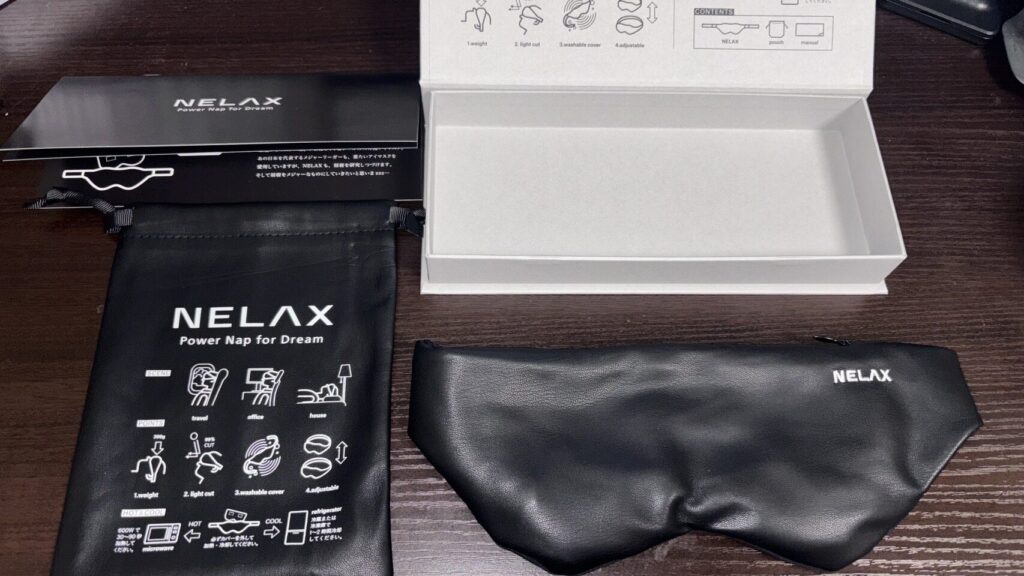 移動中は、NELAXの加重アイマスクと木こりの昼寝をセットで持ち運んでいます。