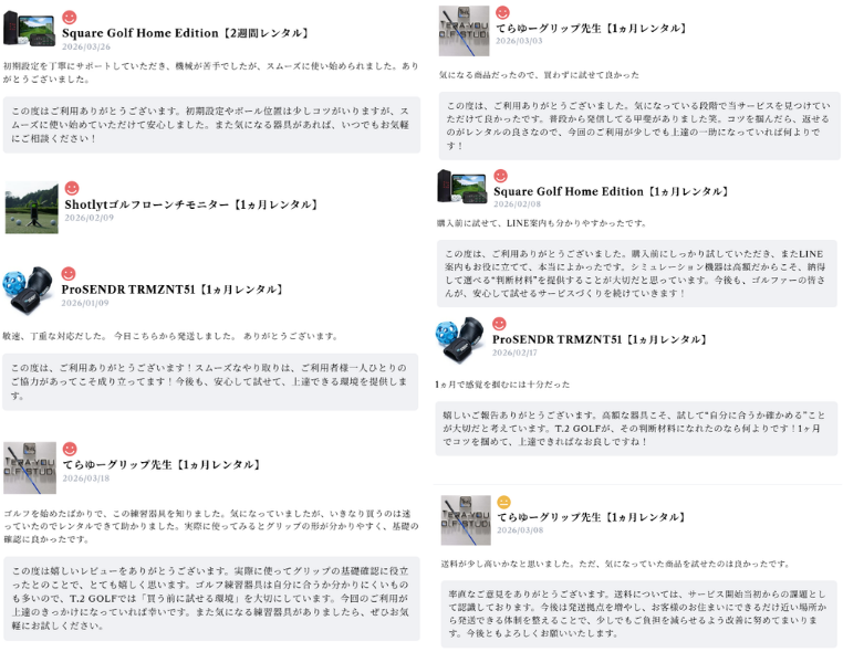 - “高品質な練習器具”レンタルサービスは、T.2 GOLFだけ